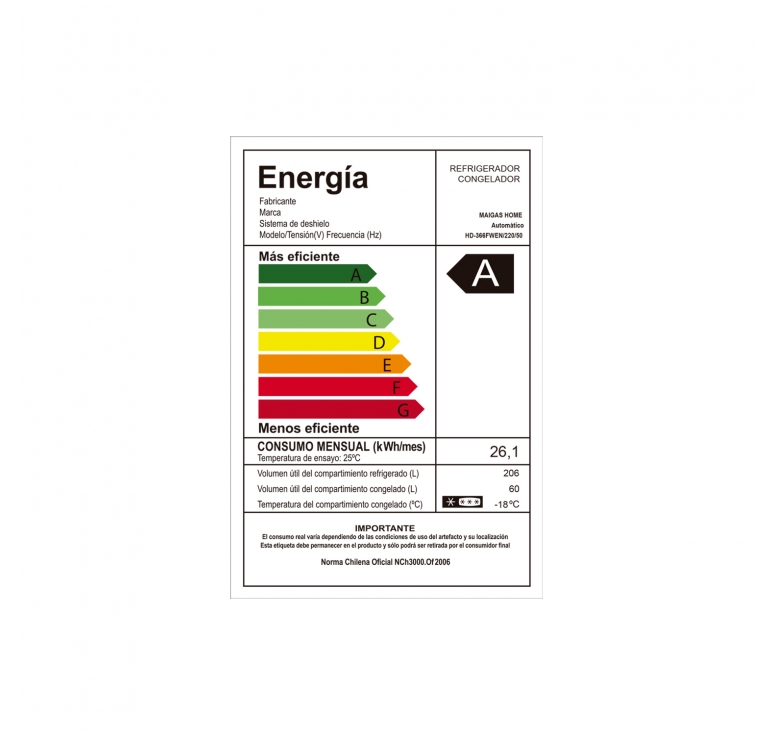 Especificaciones Técnicas Volumen bruto total. 266 L Voltaje 220V-50Hz Refrigerante R600a Volumen de compartimiento refrigerador 206 L Volumen de compartimiento congelador 60 L Consumo energético 0,87kW/24h Clase climática ST Clase energética A+